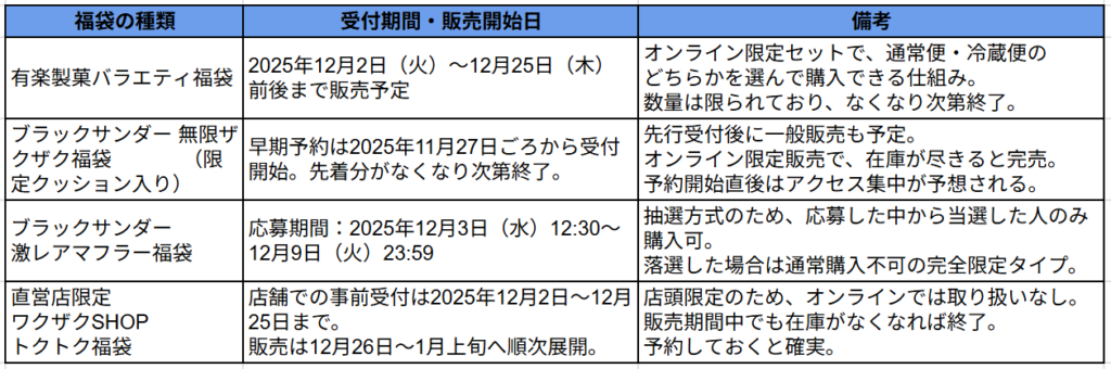 福袋別 2026年予約・抽選スケジュール一覧