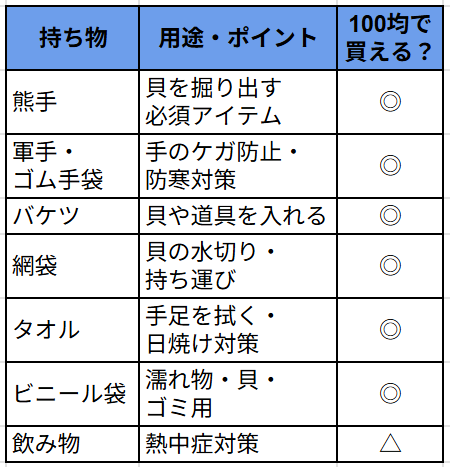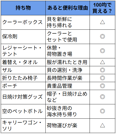 潮干狩りに行く際の道具は、ダイソーやセリア、キャンドゥなどの100均でも十分に揃えることができます。