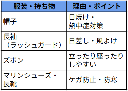 服装については、動きやすく濡れても安心なものを選ぶのがポイントです。