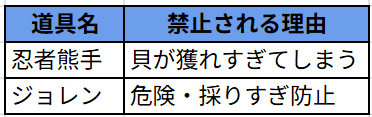 潮干狩り場によっては、以下の道具が使用禁止になっていることがあります。