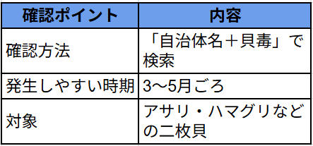 貝毒が発生している時期・海域の貝を食べると、食中毒を起こす可能性があるため注意が必要です。