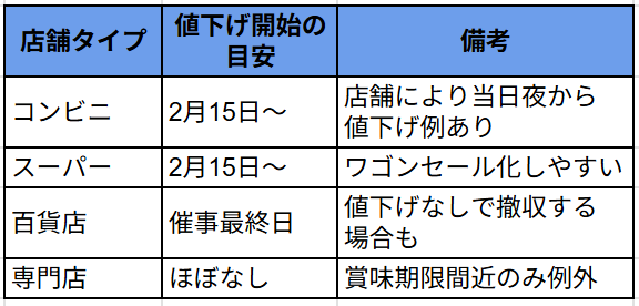 コンビニ各社では、バレンタイン翌日(2月15日)から値下げされるケースが一般的です。