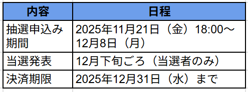 チケットは完全抽選制で、初回申し込みは2025年11月21日18時から受付開始です。