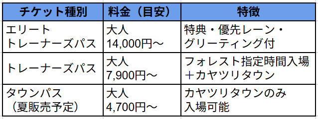 チケットの種類と料金(エリート・トレーナーズ・タウン)